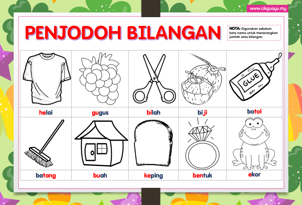 Kumpulan pemain bola sepak dari singapura itu telah mengharumkan nama negara dalam perlawanan semalam. Benda yang bergugus atau berangkai. Sepetak sawah, sebidang tanah, sebuah pulau 2. Harun menabur segenggam beras kepada anak ayamnya. Buah anggur, kelapa sawit, pulau. Posts about penjodoh bilangan written by cikguhii. Untuk sekumpulan manusia, haiwan dan benda. Ruangan penjodoh bilangan ini menghuraikan tentang perkataan yangdigunakan berpasangan dengan nama apabila. Bandar, negeri, kampung, pulau, banglo, rumah, jambatan, sekolah, beg, komputer, papan kekunci, radio, mesin basuh, kereta, motosikal, basikal, . Lembar, benda yang panjang dan luas bidangnya, sebidang kain ; Laras, senjata, selaras senapang ;